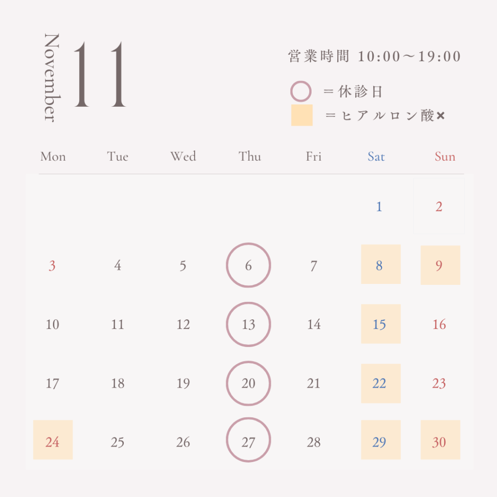 ※ヒアルロン酸対応不可→8日,9日,15日,22日,24日,29日,30日